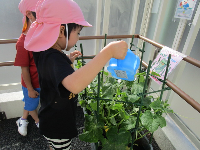 きゅうりは園庭から玄関のスロープに場所を移し、子ども達は毎日頑張って水やりをおこなっていましたよ✨