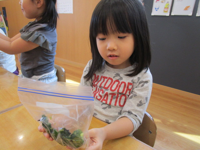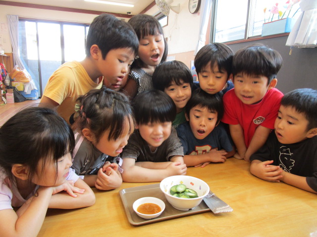 栄養士さんに叩いたきゅうりの中に塩昆布とごま油を入れてもらい、みんなで順番に揉みこみました🎵