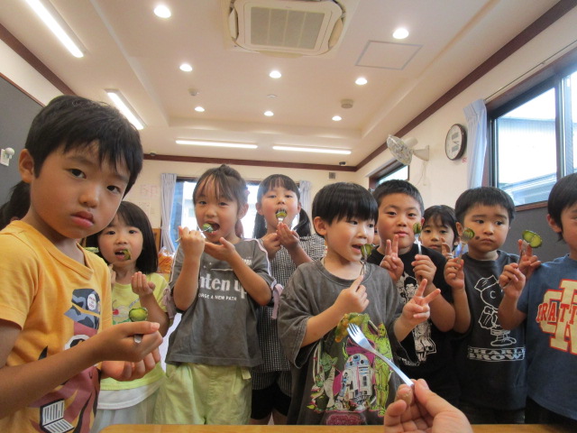 自分たちで大切に育ててきたきゅうりの味は特別美味しかったようで、ぺろりと完食し「もう1個たべたい!」とおかわりジャンケン大会が開催されました🎵