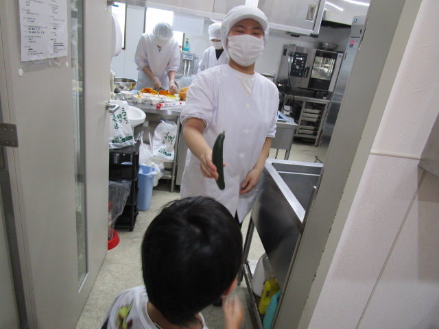 水道できゅうりをよく洗い、給食室へ届けに行きました!