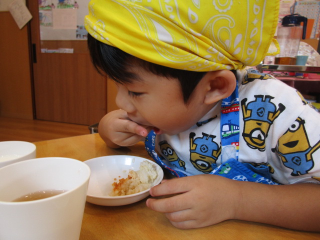 4月と5月は園庭で食べましたが、これからの暑い時期は食中毒予防の為、室内で食べることになっています。