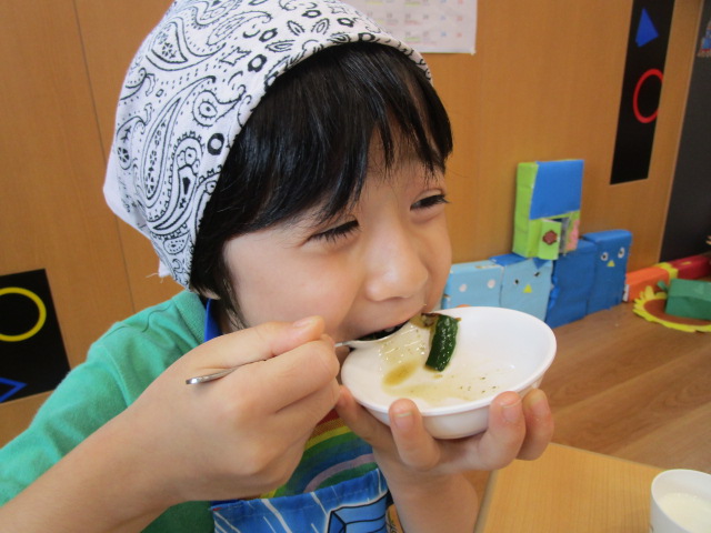 おにぎりを焼いている間、待っている子たちは栽培しているきゅうりを収穫しておいたので、大好きな「たたききゅうりのごま油塩昆布和え」をおにぎりの付け合わせに作っていました🥒