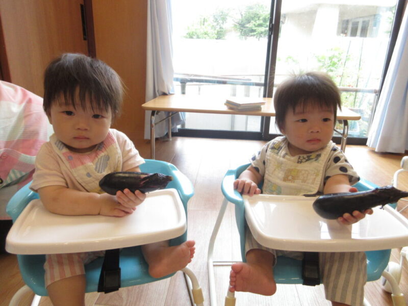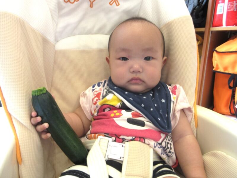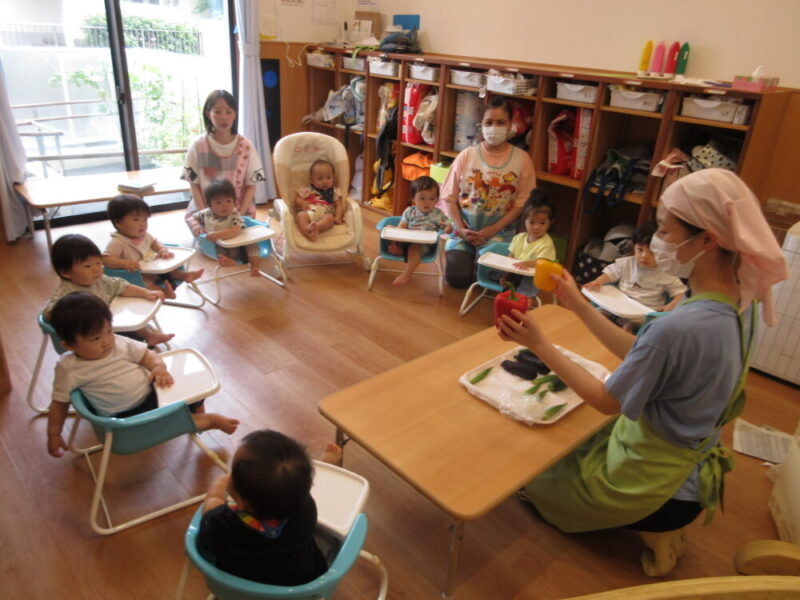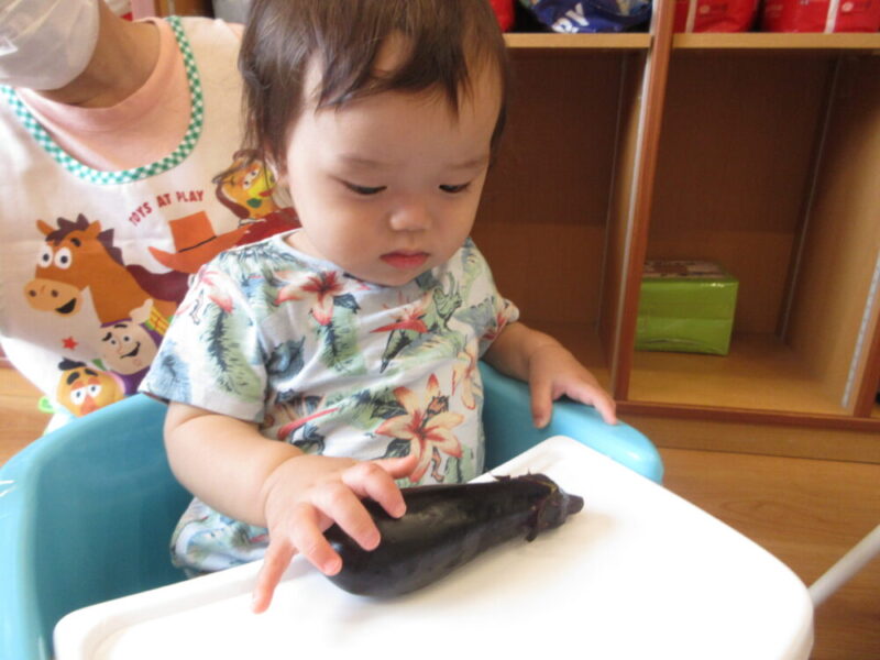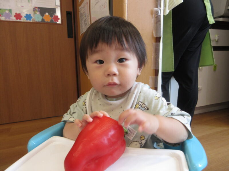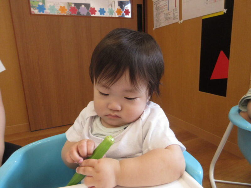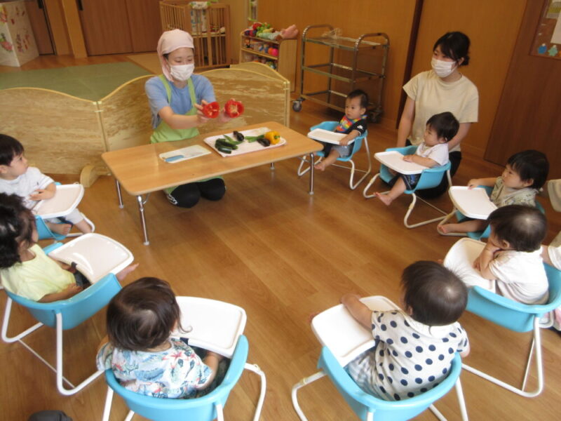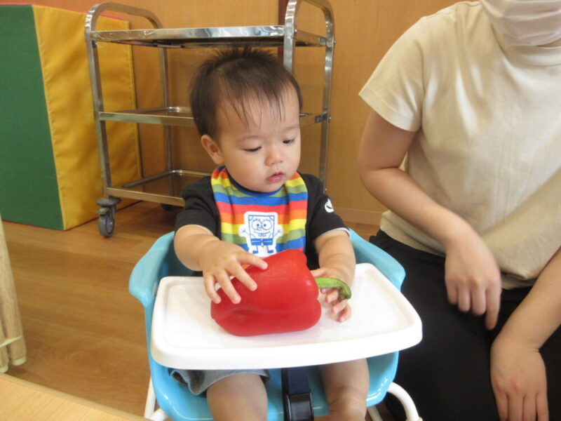野菜を切ってもらい断面を見て興味津々の子どもたち。