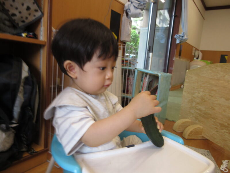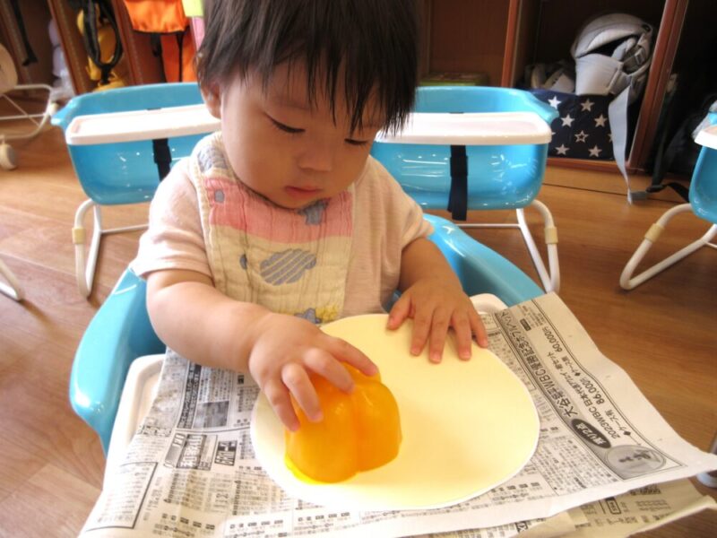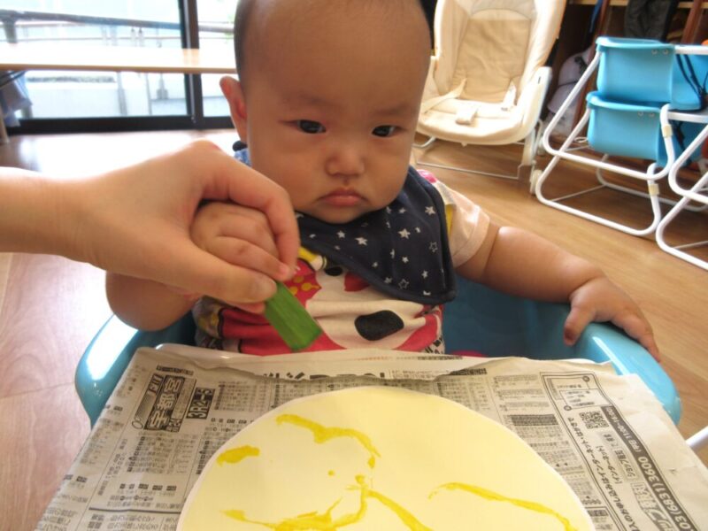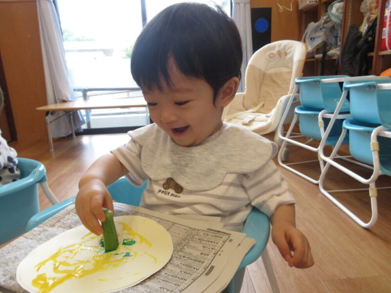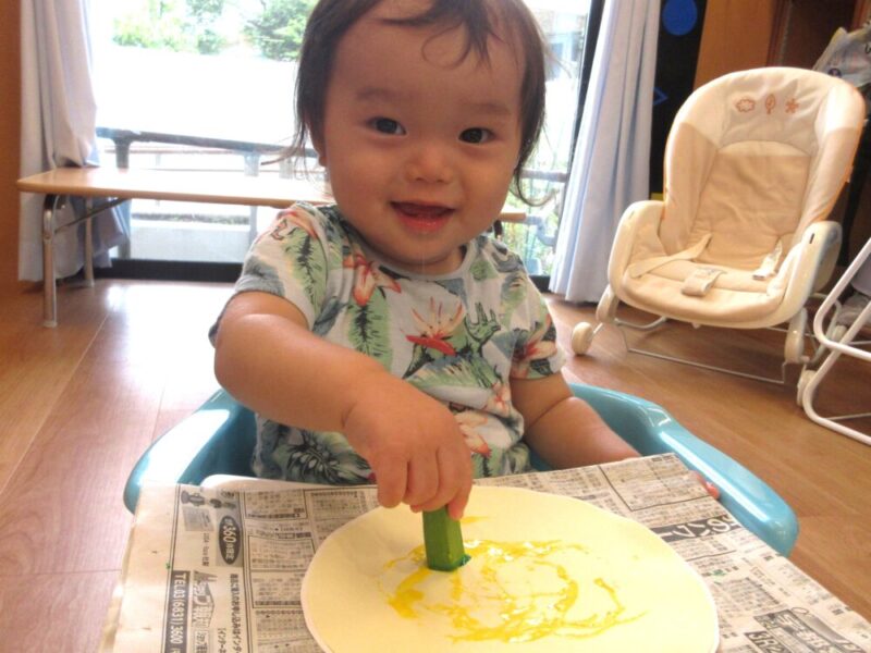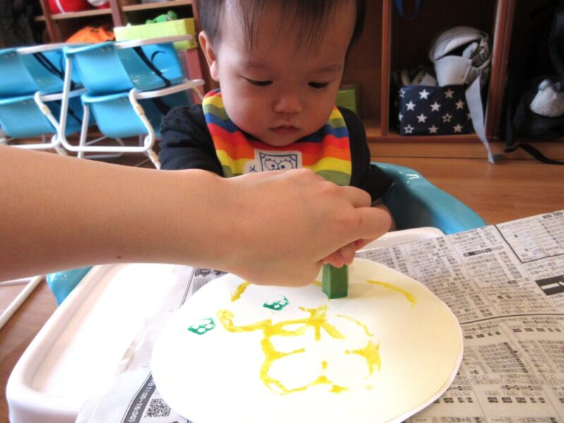 スタンプで色がつくことに不思議そうで、絵の具の部分を触って確かめる姿もありました。