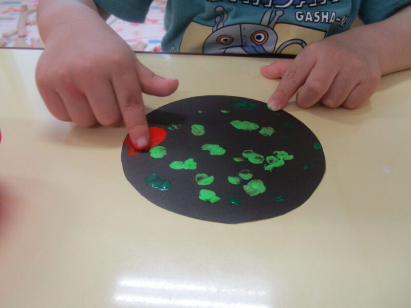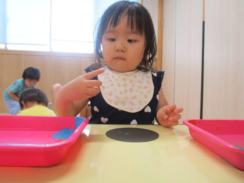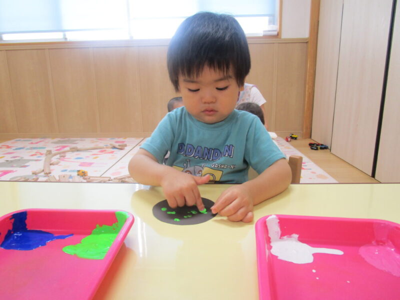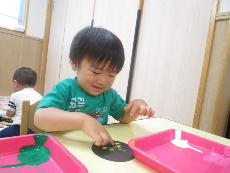 保育者と一緒にスタンプすると、慣れてきて自ら絵の具に手を伸ばしたり
