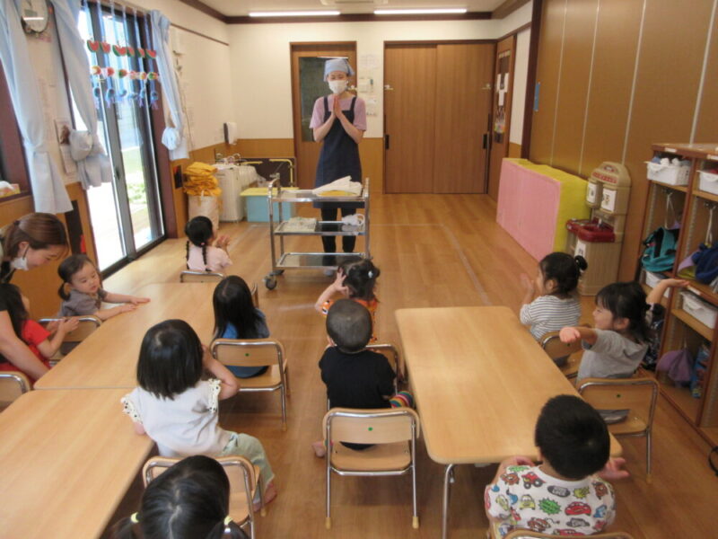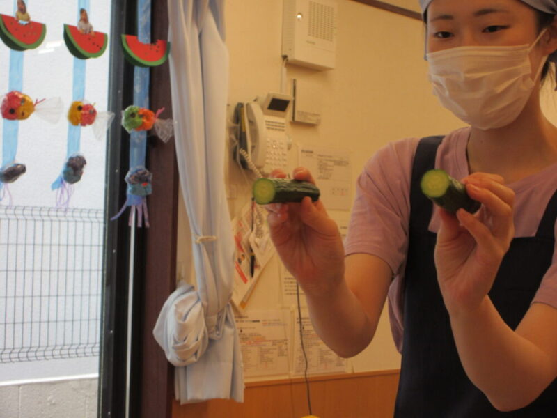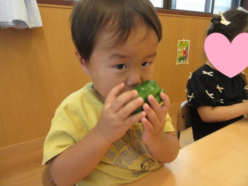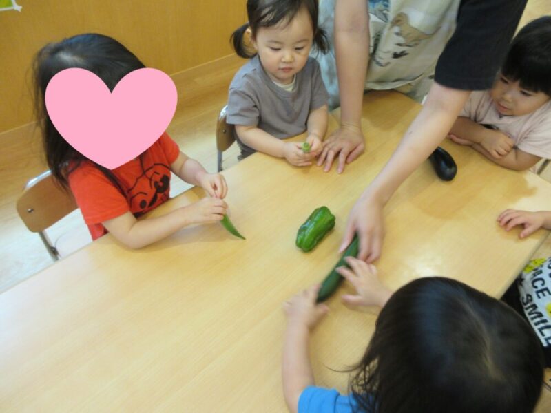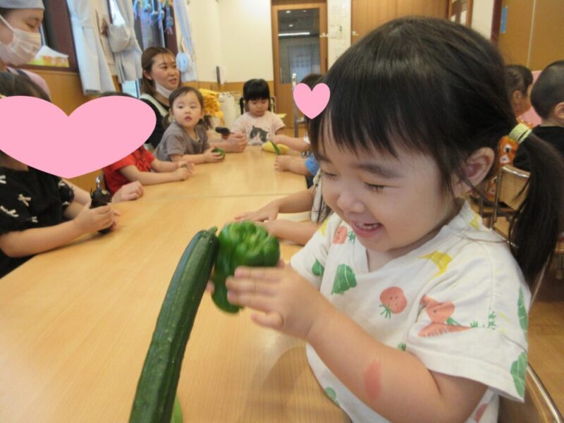 「この野菜は何でしょう?」のクイズにすみれ組のお友達は「きゅうり!」「ピーマン!」と答えてくれました!