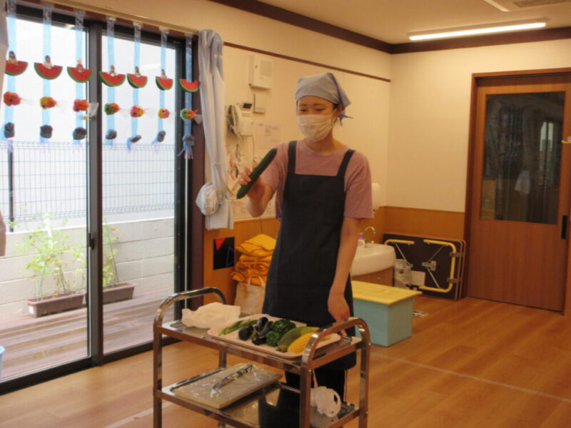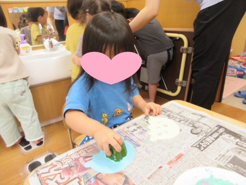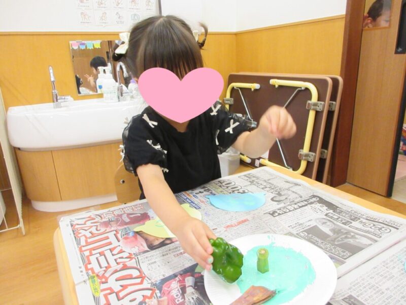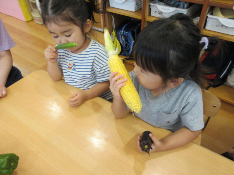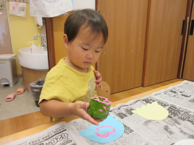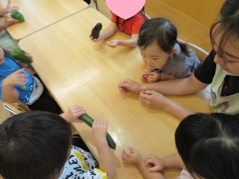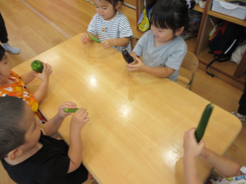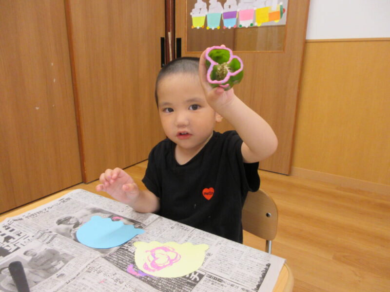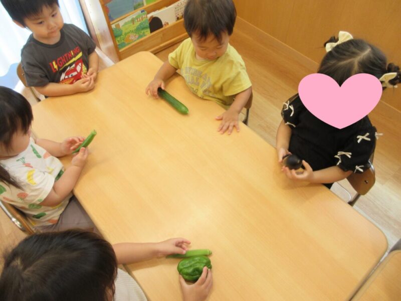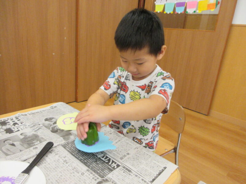 すみれ組では、7月の食育で夏野菜に触れる体験とスタンプ制作をしました!🥒