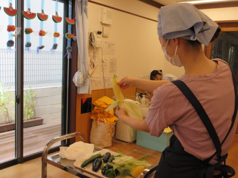 とうもろこしの皮を目の前でむいてくれました!粒の部分が見えると、「知ってる!」「見たことある!」と大興奮の様子でした😊