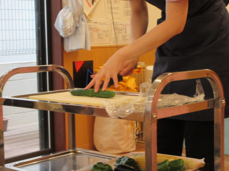 次に、栄養士の先生が目の前で野菜を切ってくれました!