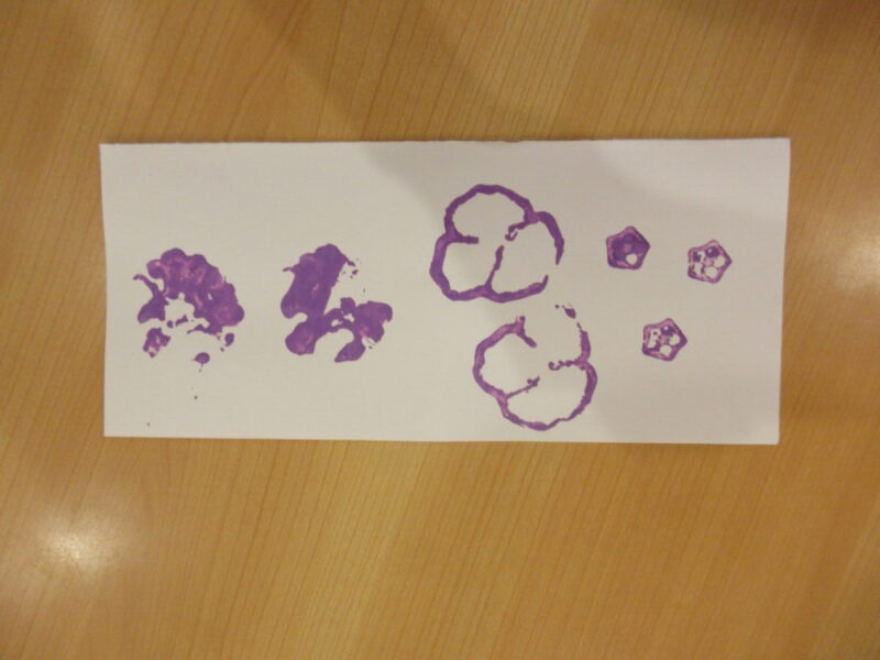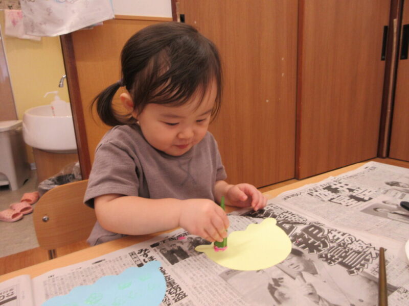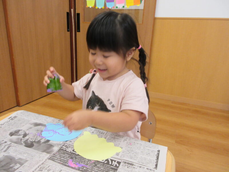 ピンク、紫、緑の絵の具を使って好きなようにスタンプをしていきます💞