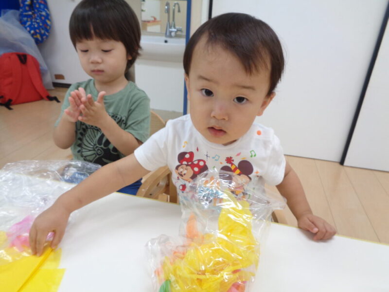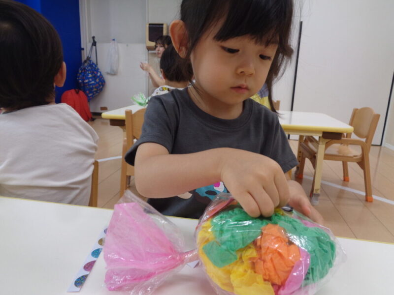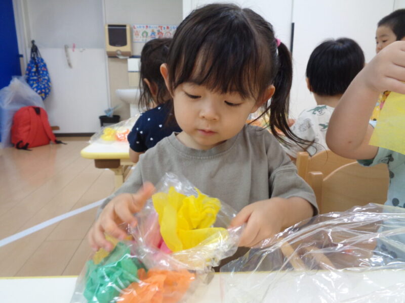 好きな色の花紙を選び、丸めてからビニール袋に入れます。