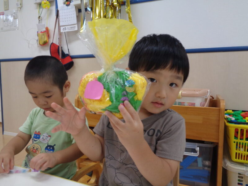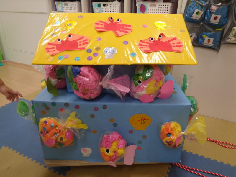 うさぎ組の作った魚と手形のカニと、ぞう組の魚とシールの飾りつけで豪華な山車が完成しました✨