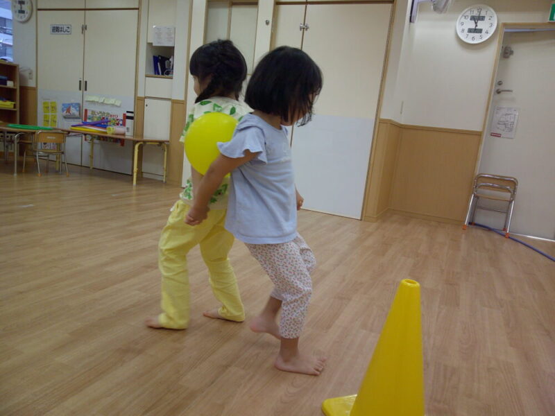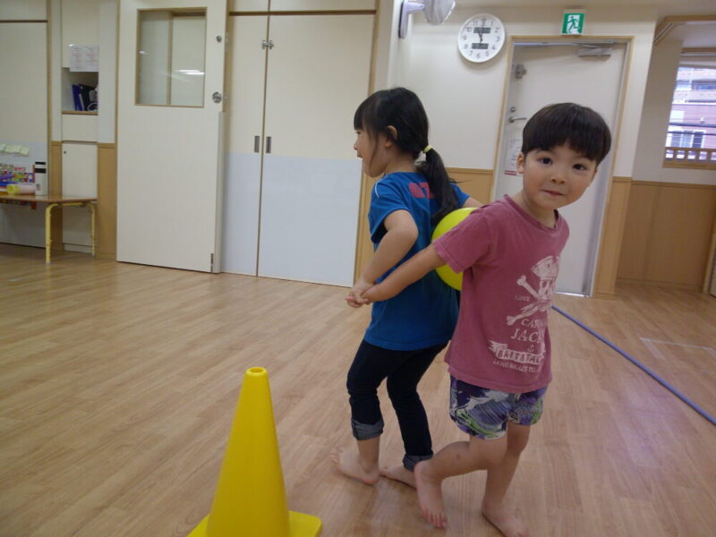 背中合わせになり、その間に風船を挟み落とさないようにカラーコーンを回っていくゲームです。