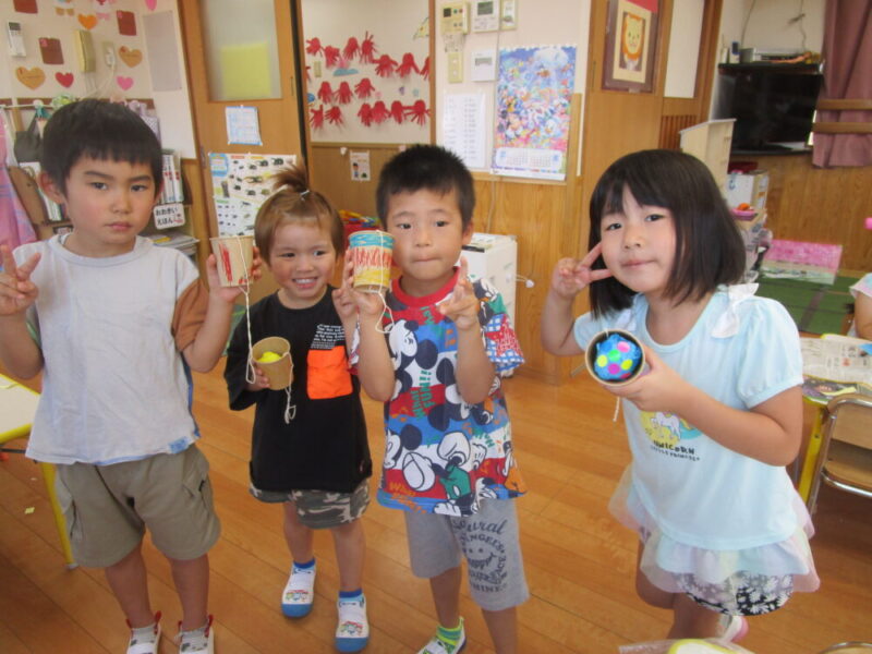 暑さを紛らわすために、「アイスクリームを作ろう!」となり、アイスクリームのけん玉製作をしました☆