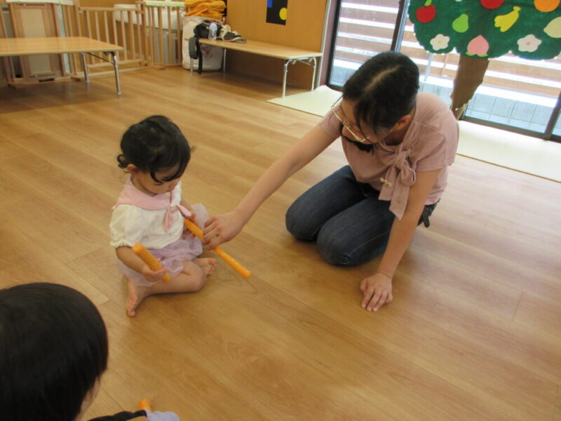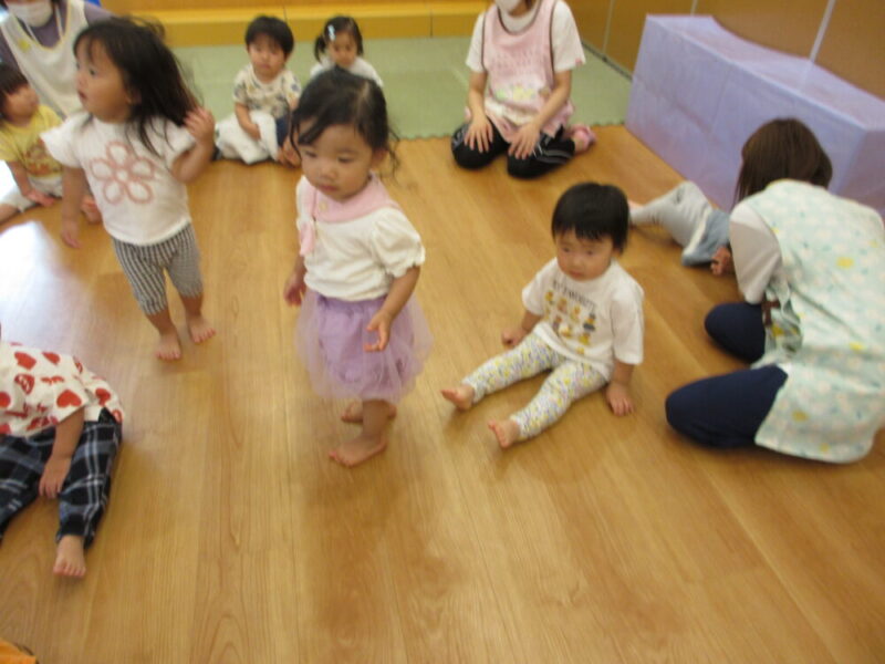お母さんや保育園のお友達と一緒に、リズムに乗って楽しく身体を動かしました♪