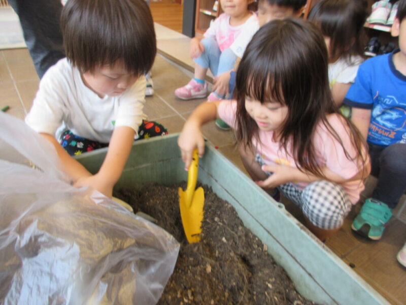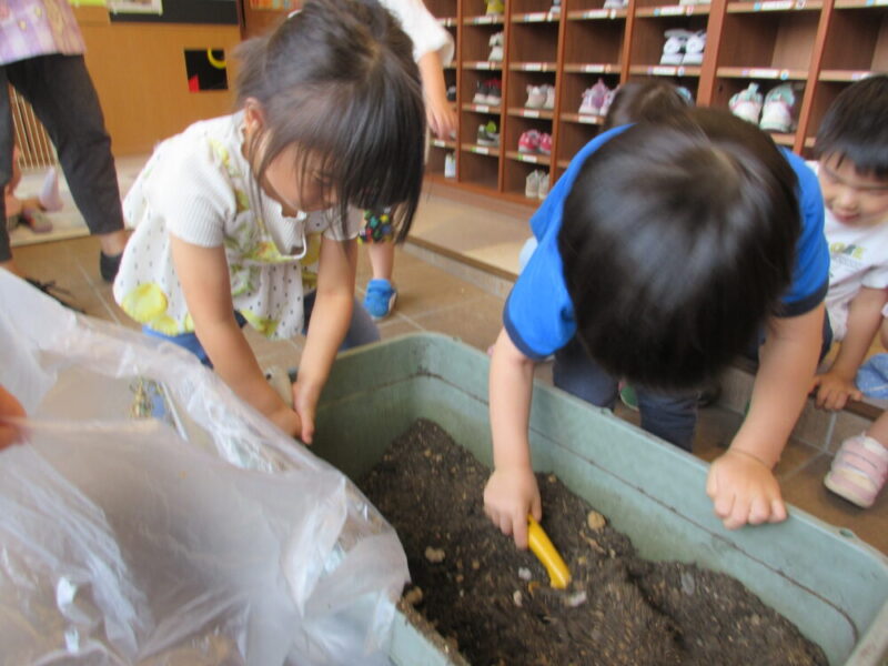 保育者が茎・葉っぱを取り、子どもたちは土の片付けをしました。