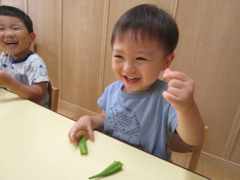 八広園【2歳児 くも組】食育 ~オクラをさわってみよう~