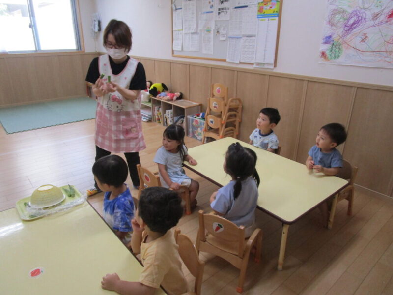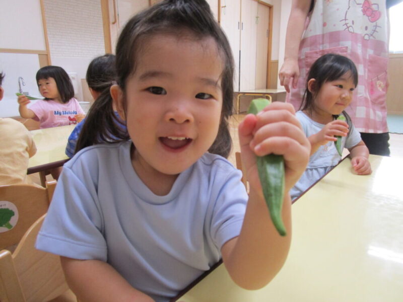 八広園【2歳児 くも組】食育 ~オクラをさわってみよう~