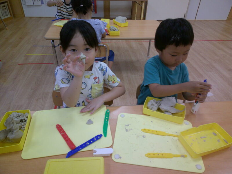「粘土遊びするよ~」と声を掛けると「よっしゃー!」「やった!嬉しい」と全員が喜んでいます。