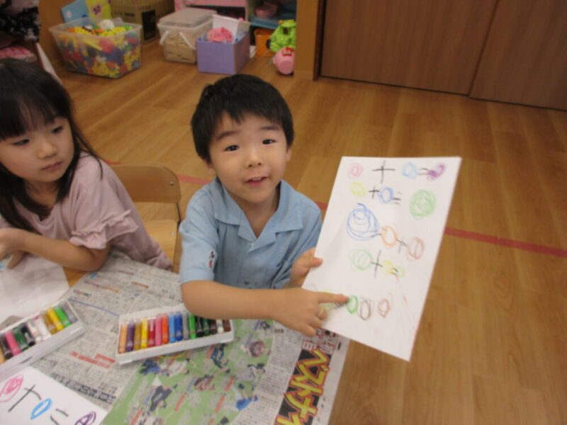 子どもたちも自分がわかるように、クレヨンで「〇と〇=〇」と書いてみました!