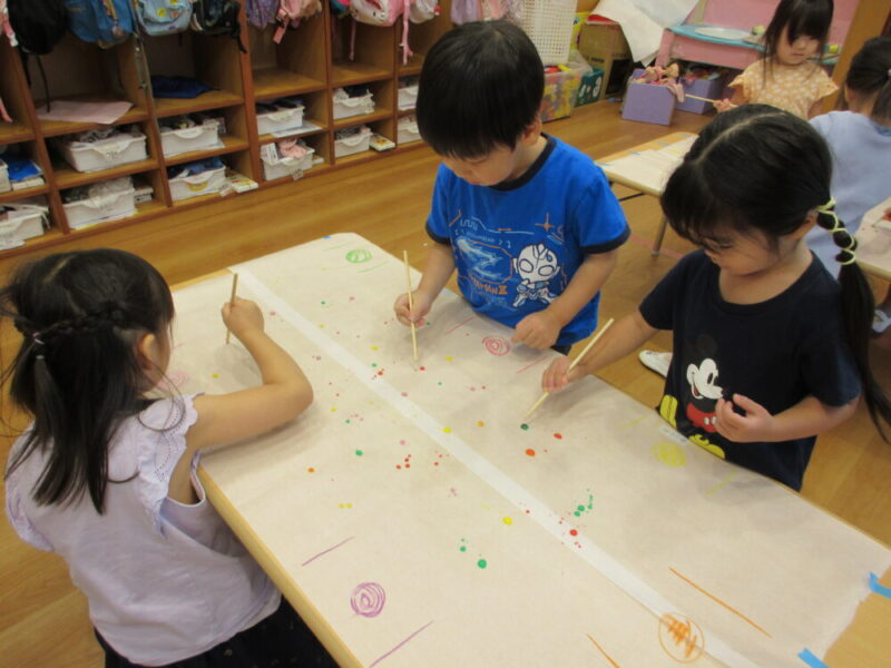クッキングシートを敷いてスポイトで絵の具を垂らし、割りばしを使って移動させます。