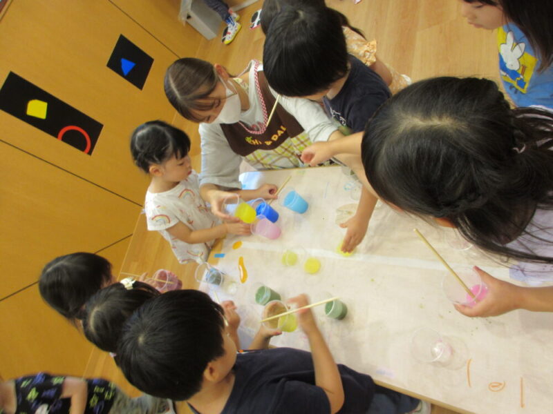 まずはコップに沢山の色水を作り、子どもたちに何色か聞いて何味のジュースにするか考えました。「赤はりんご~!」「黄色はレモン~」「黄緑はメロン~」と色々な味のジュースが完成しました✨