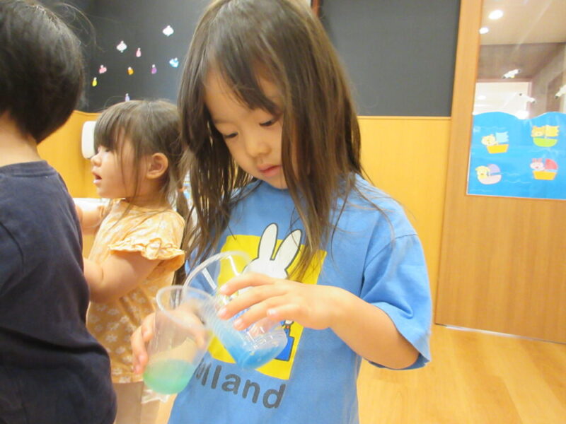 その次は前の日に実験した、コップで色の変化を楽しむ事をしました。