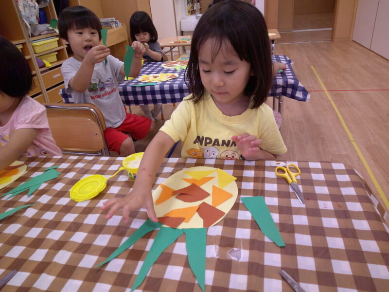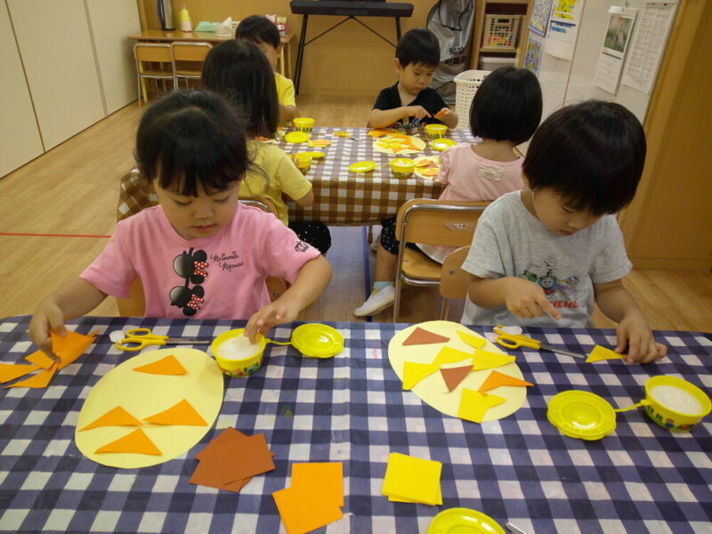 パイナップルのイラストを見せて「今日はこれを作るよ~!」と子どもたちに伝えると、「ぱっぱっぱぱっぱぱいなぽ~」と大好きなパイナポー体操の歌を口ずさんでいました(笑)