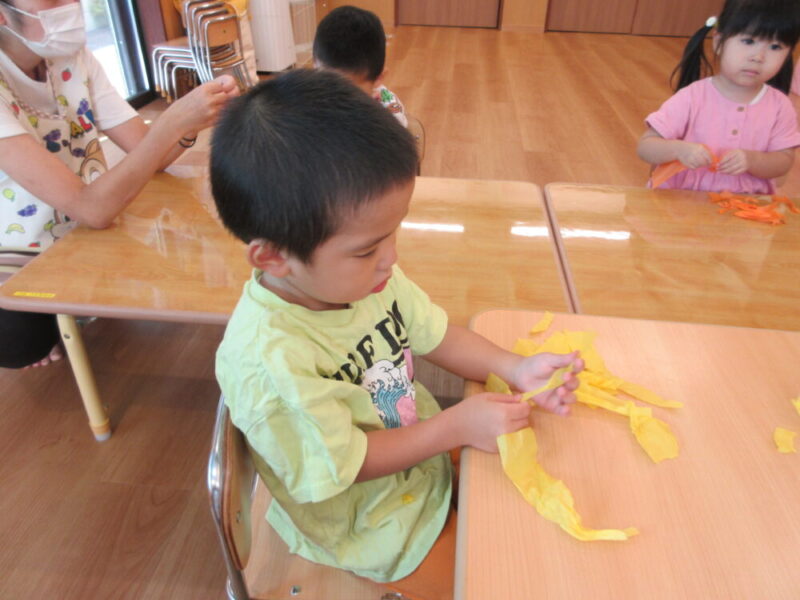 まずは、お花紙をビリビリ小さくちぎっていきます!