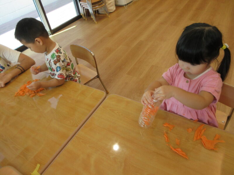 お花紙をちぎった後は、ペットボトルに入れていきます。