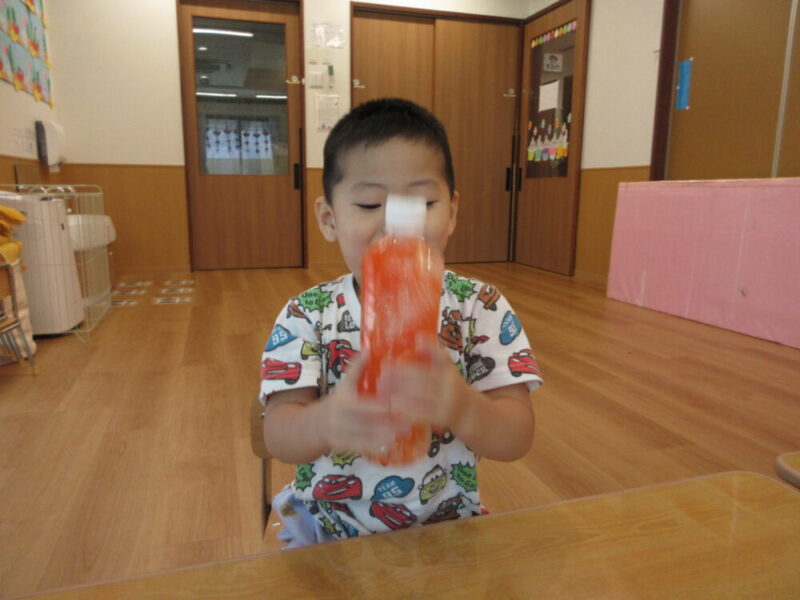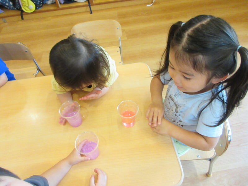 色水をコップに注いでみると、「わ~!」「おいしそう~!」と思わず拍手をして喜ぶ姿が見られました🤭