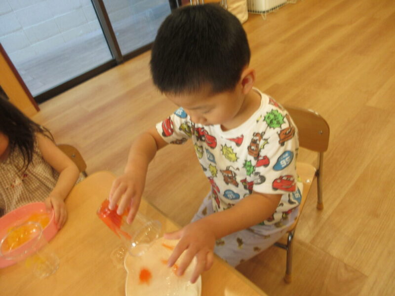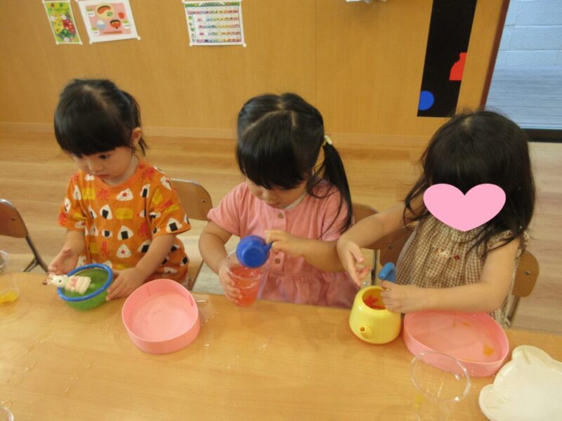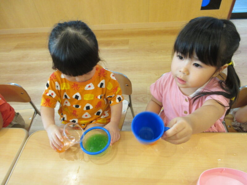 子どもたちは、おままごとのお皿やスプーンを使って違う色の色水を混ぜ、オリジナルジュースを作ってみたりもしました🥰