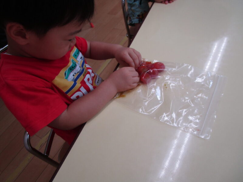 汁がでてきた~。と大はしゃぎです。お友だちと順番で潰していきます。