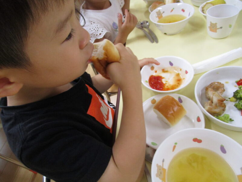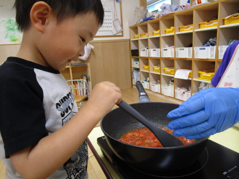 食育でトマトのジャムを作りました。登園時からみんな楽しみにしてどこかソワソワしている様子が伺えました。栄養士さんのお話を聞いてからさっそくジャム作りに挑戦です。