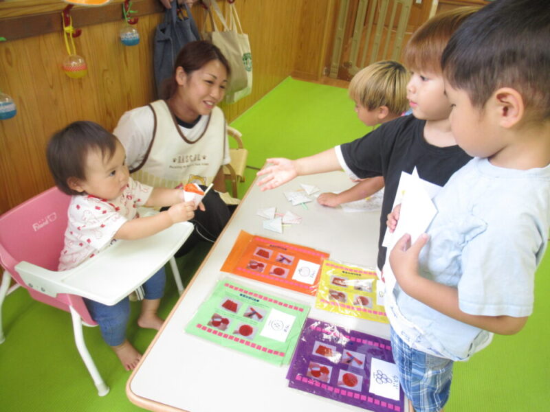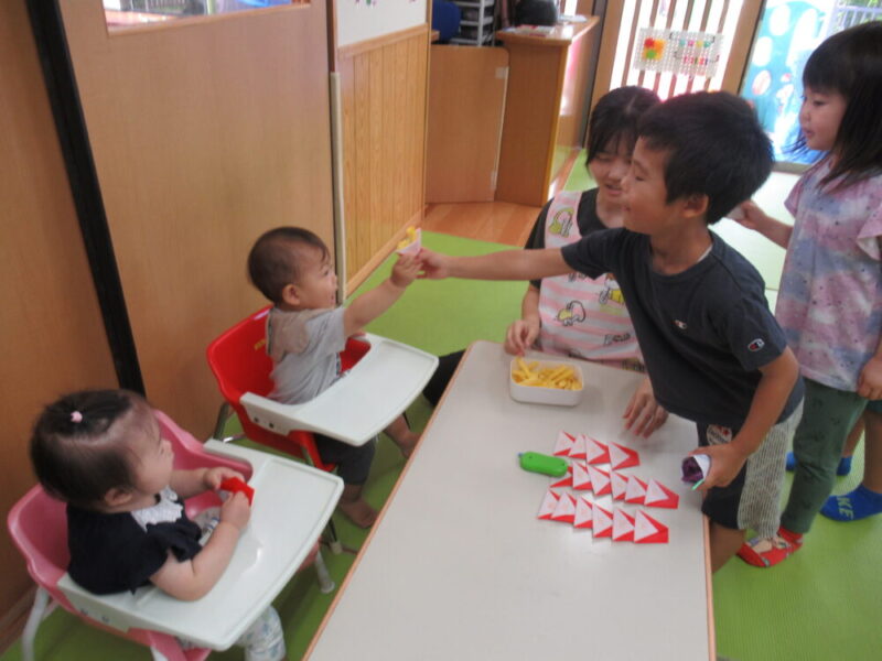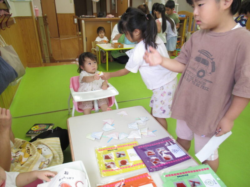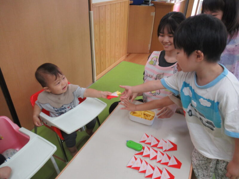 最初は緊張していたお友達も、慣れてくるとお兄さんお姉さん達に「はい、どうぞ♪」と手渡しすることができていましたよ。短い時間でしたが交流の機会を持てて良かったね!また一緒に遊ぼう!