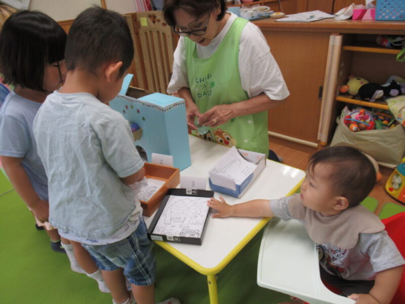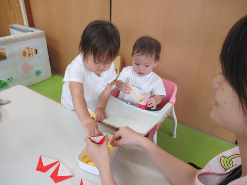 この日はらいおん組さんを招待してミニお店屋さんごっこをしました!先生が用意したグッズを使い、あひる組さんには「ポテト屋さん」「ジュース屋さん」「ガチャガチャコーナー」の店員さんになってもらいました!