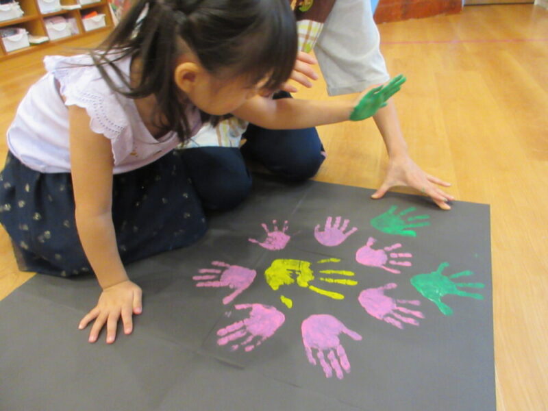花火では子どもたちの手形で表現をしました。真ん中は保育者の手でその周りに子どもたちの手形を取りました。子どもたちは「先生の手大きいね~!」など驚きながら、自分の手を確認して「どのくらいかな~」と言っていましたよ!
