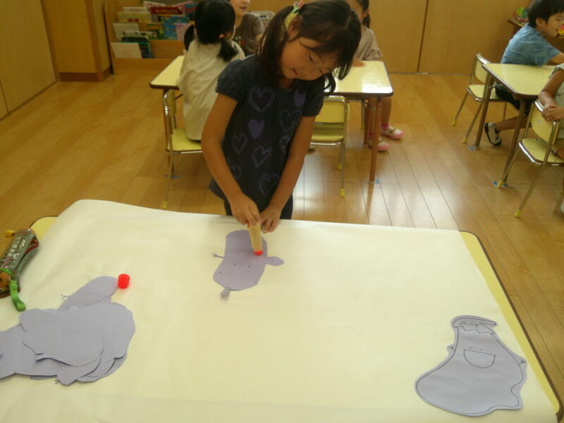 去年、ぶどう組の時にキュウリの製作をしたことを思い出して「ナスの製作したい~!」と言うので、ナスを観察して、製作をしました👀🍆