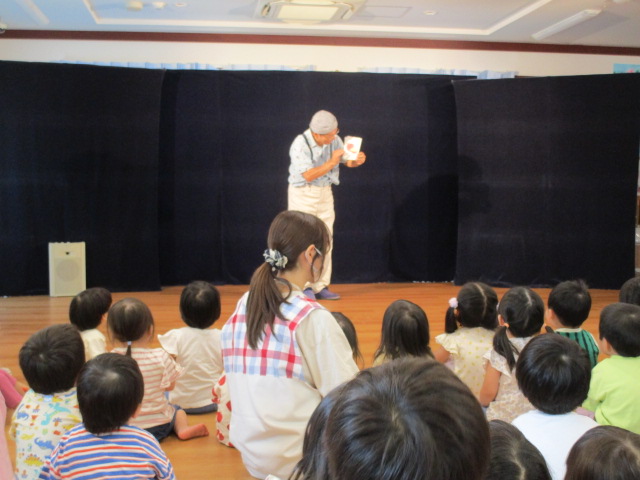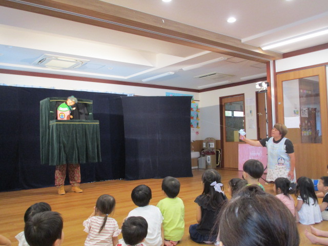 人形劇はピーターパンがモチーフでフック船長がどうにかピーターパンに意地悪をしようとするストーリーでしたが、フック船長を応援している子が多かったです。「地震だ!」「雷だ!」と意地悪しようとするフック船長にバチが当たり、逆にやられてしまうシーンでは声をあげて笑っていた子どもたち。