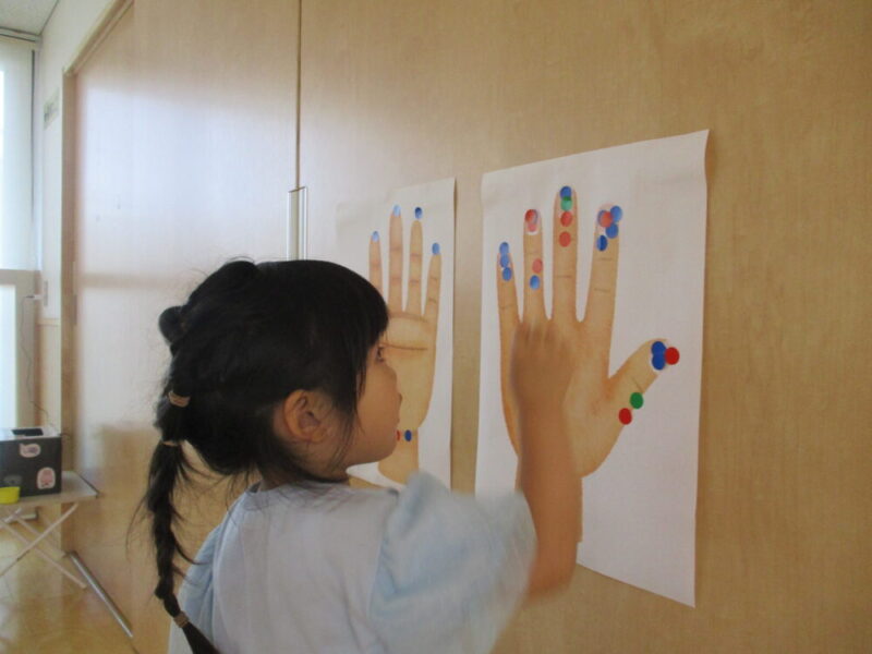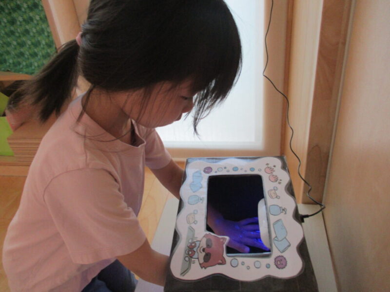 その後は、実際にブラックライトに反応をするクレヨンを手につけ、手洗いの実践!洗い終わった後に、どこに汚れが残っていたかをシールを貼って、目で見て確かめました。