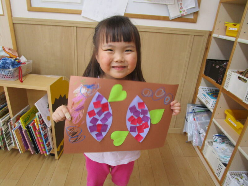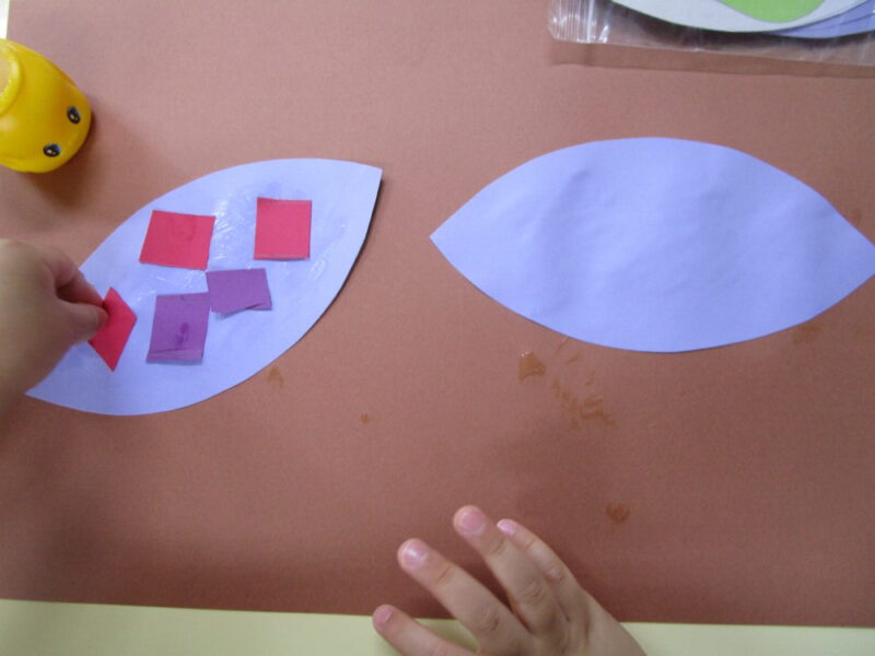次は小さくなった画用紙をおいもに貼っていきます。糊の使用は使い方も上達し糊を塗ってペタペタと貼っていきます。小さな指でぬりぬりとしている姿がとても可愛らしいです。