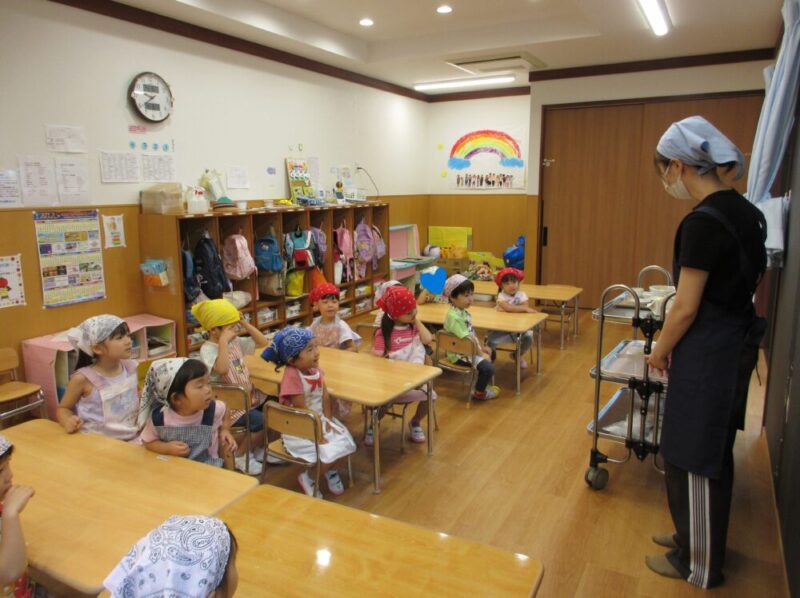 先日、ゆり組では、食育でクッキー作りをしました。初めに、栄養士の先生から材料などの話を聞きました。