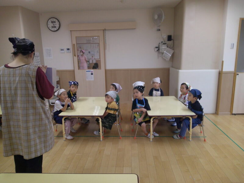つき組さんはエプロン三角巾を身に付けての食育は2回目です。