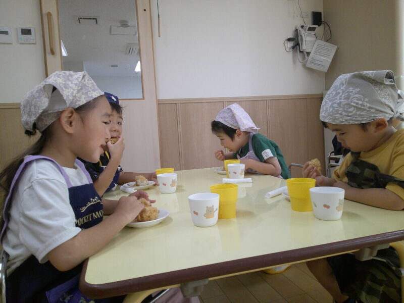 みんな作り終わって、おやつの時間♪「おいし~❤」と大きな口でぱくっと食べていました。自分で作るとより美味しい!