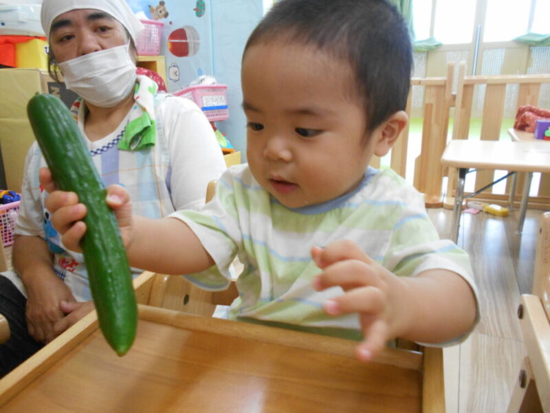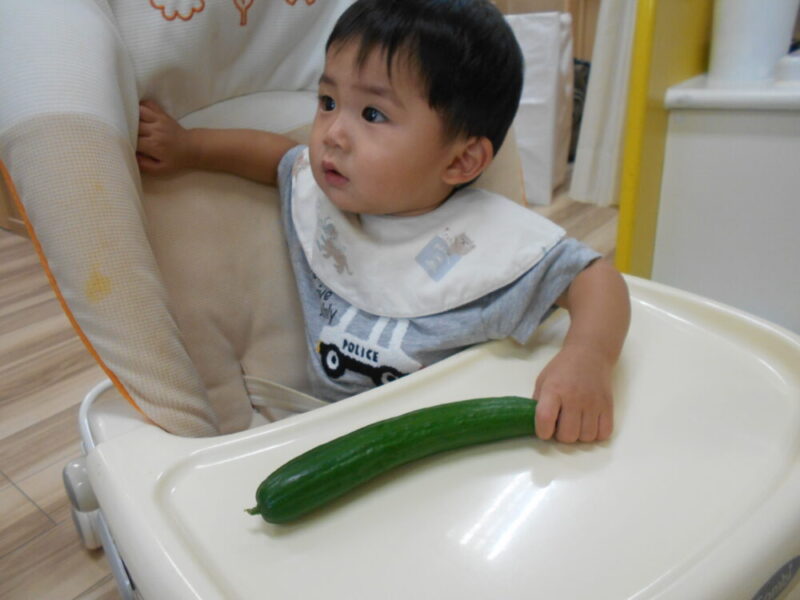 きゅうりさんだよ~、つぶつぶしてるね~などと声を掛けながら