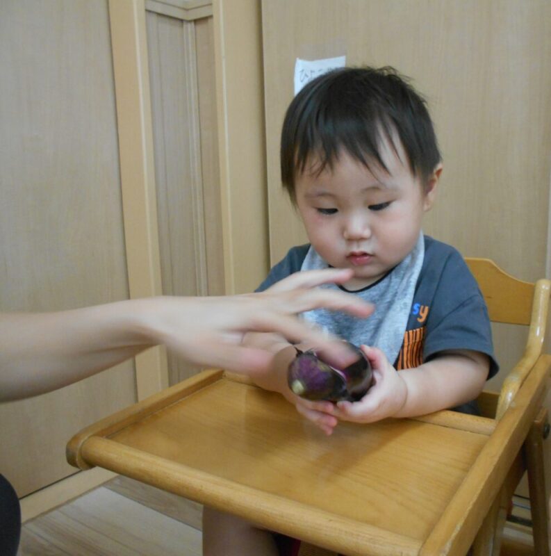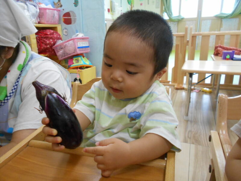 六町園~食育活動・ひよこ組・きゅうりとなすを触ってみよう~