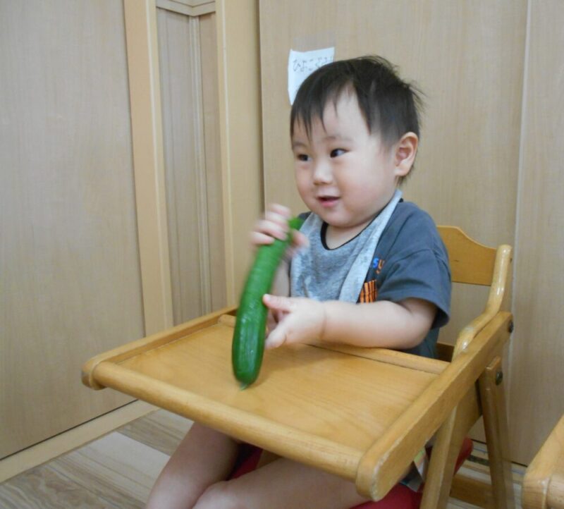 きゅうりさんだよ~、つぶつぶしてるね~などと声を掛けながら