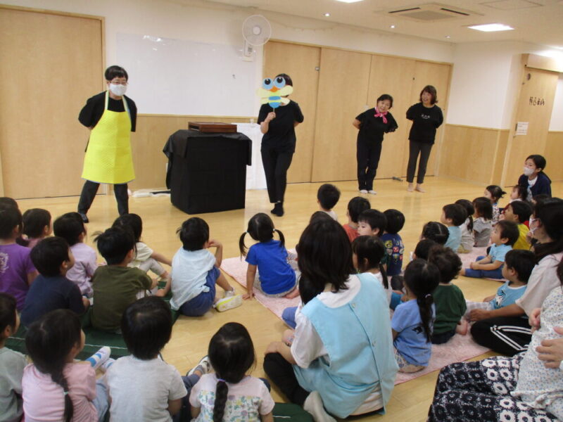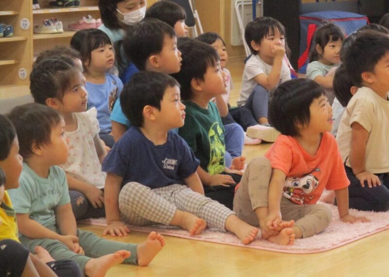 今日は楽しみにしていた【ずっこけさんのおはなし会】です!ホールにみんなで集まって、わくわくしながら始まるのを待っていました。