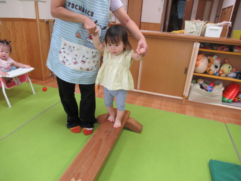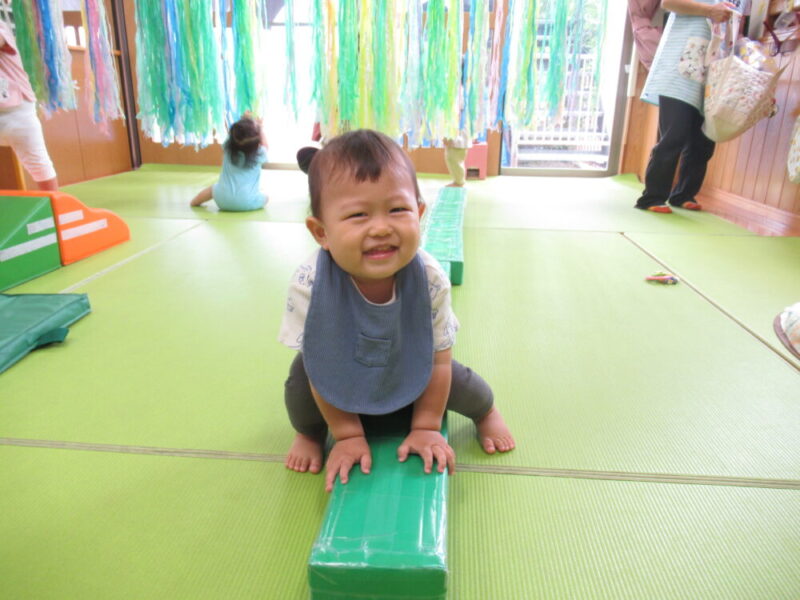 マットのお山を越えたり、高月齢のお友達は平均台にも挑戦中です!本番はお父さんやお母さんと仲良く手を繋いで進んでね♪ みんな大好きトンネルはニコニコの笑顔で進んでくれますよ。