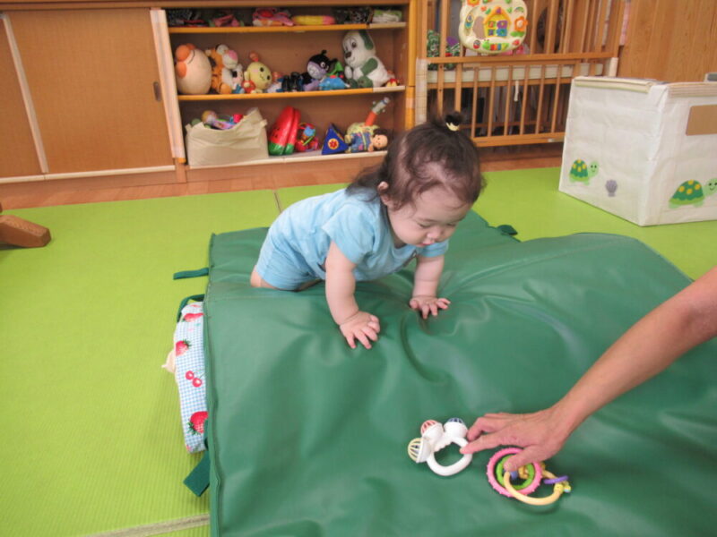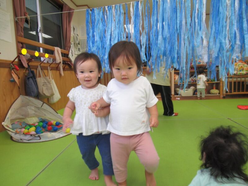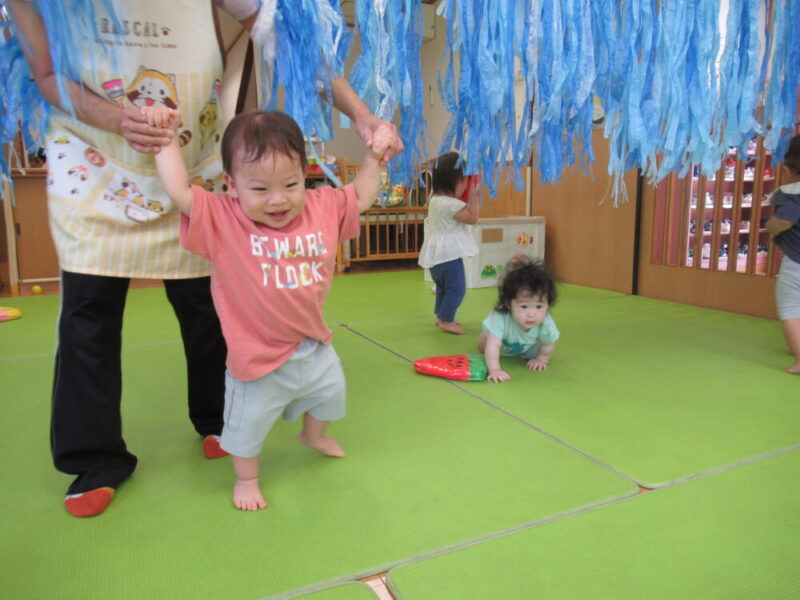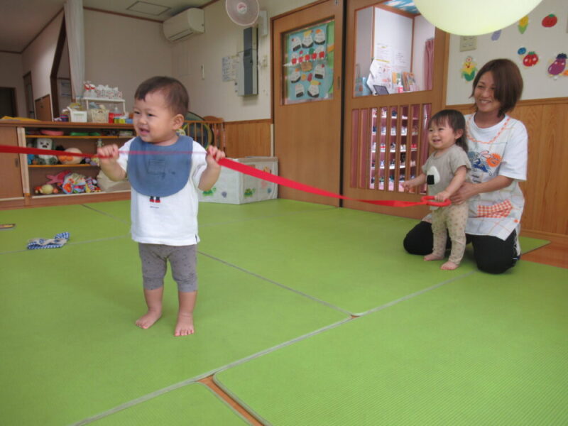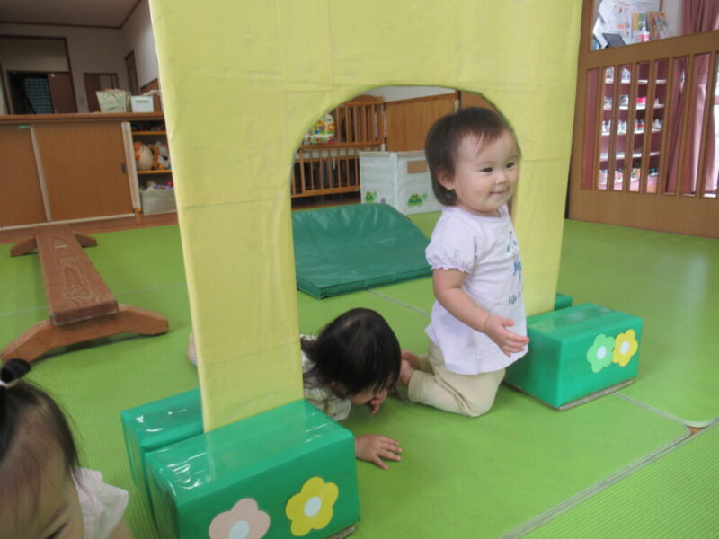 マットのお山を越えたり、高月齢のお友達は平均台にも挑戦中です!本番はお父さんやお母さんと仲良く手を繋いで進んでね♪ みんな大好きトンネルはニコニコの笑顔で進んでくれますよ。